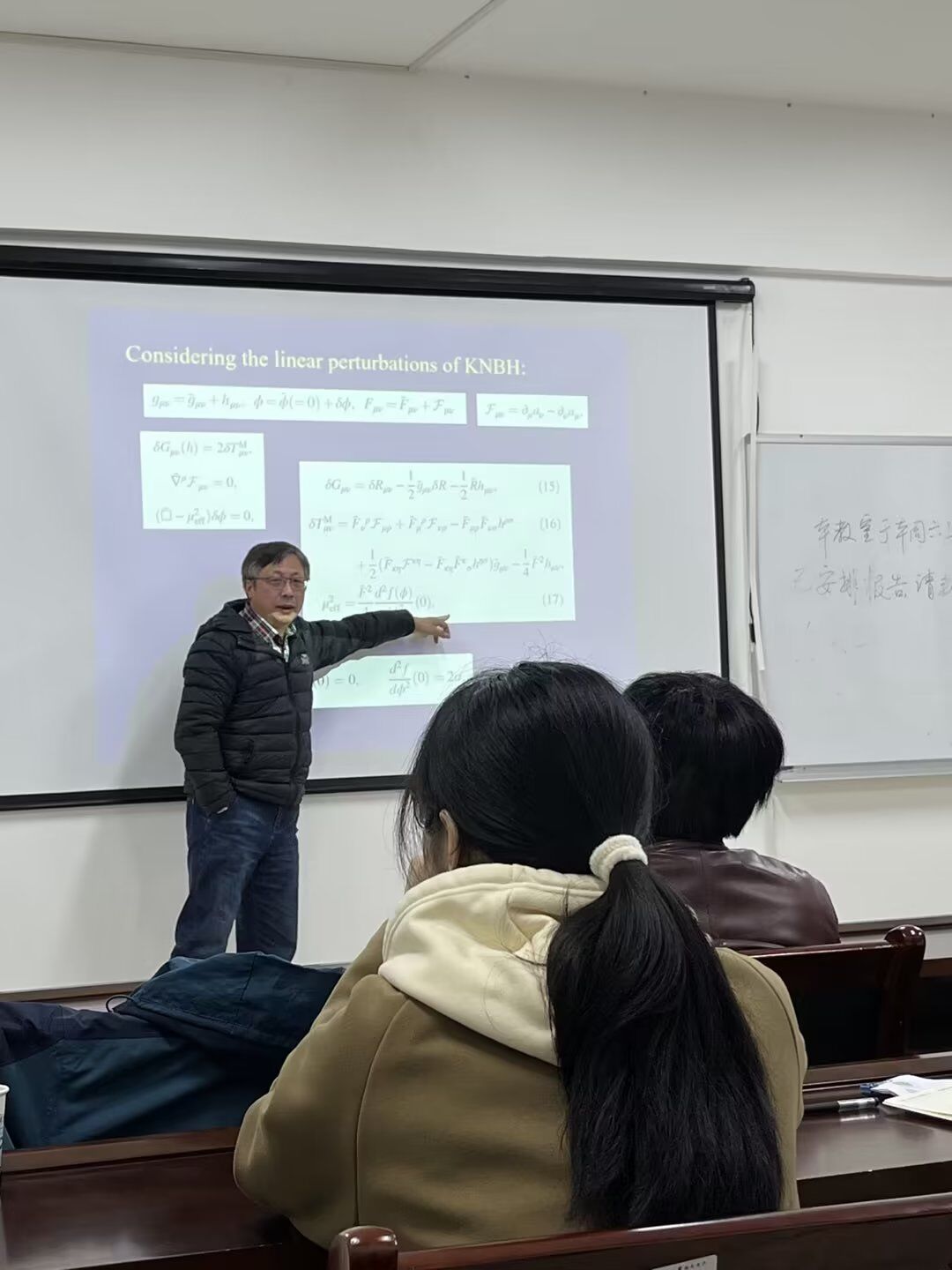 岳瑞宏在报告讲解过程中思路清晰,思维严谨,以渊博的知识讲述了自旋电荷诱导转动黑洞的自发标量化以及该黑洞的稳定性。