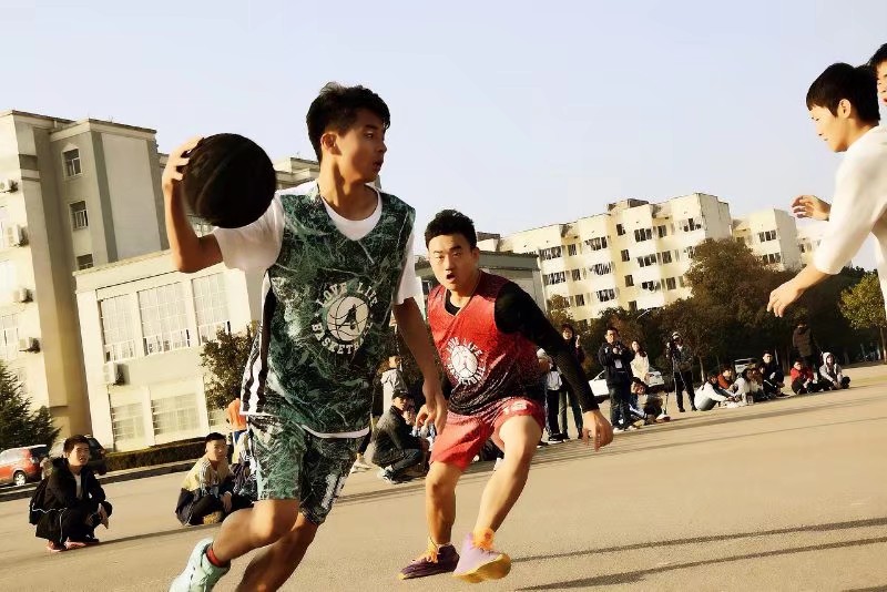 篮球场上,队员们动作连贯、配合默契、投篮准确,比赛气氛紧张热烈。经过一个多月的激烈角逐,最终,16级联合队和17级联合队在比赛队伍中脱颖而出。决赛初始,17级队员在其队长的带领下组织进攻,默契的合作,在第一、二节暂时保持着优势。由于比赛前期比分的落后,16级篮球队队长立即调整心态,发现问题,调整战术。第三节开始,16级队员全力打好配合,寻找“突围”的机会。16级24号球员弯着腰,篮球在他的手下前后左右不停地拍着,突然他加快了步伐,变向转体,冲过了两层防线,来到篮下,一个虎跳,转身投篮,球进了。16级联合队乘胜追击,比分逐渐拉近,比赛进入白热化阶段。第四节,比赛的最后阶段,16级队员展开攻势,一个又一个漂亮的三分入筐。最终,16级联合队以63:53的比分赢得冠军。最后,获胜队伍与工作人员合影留念。