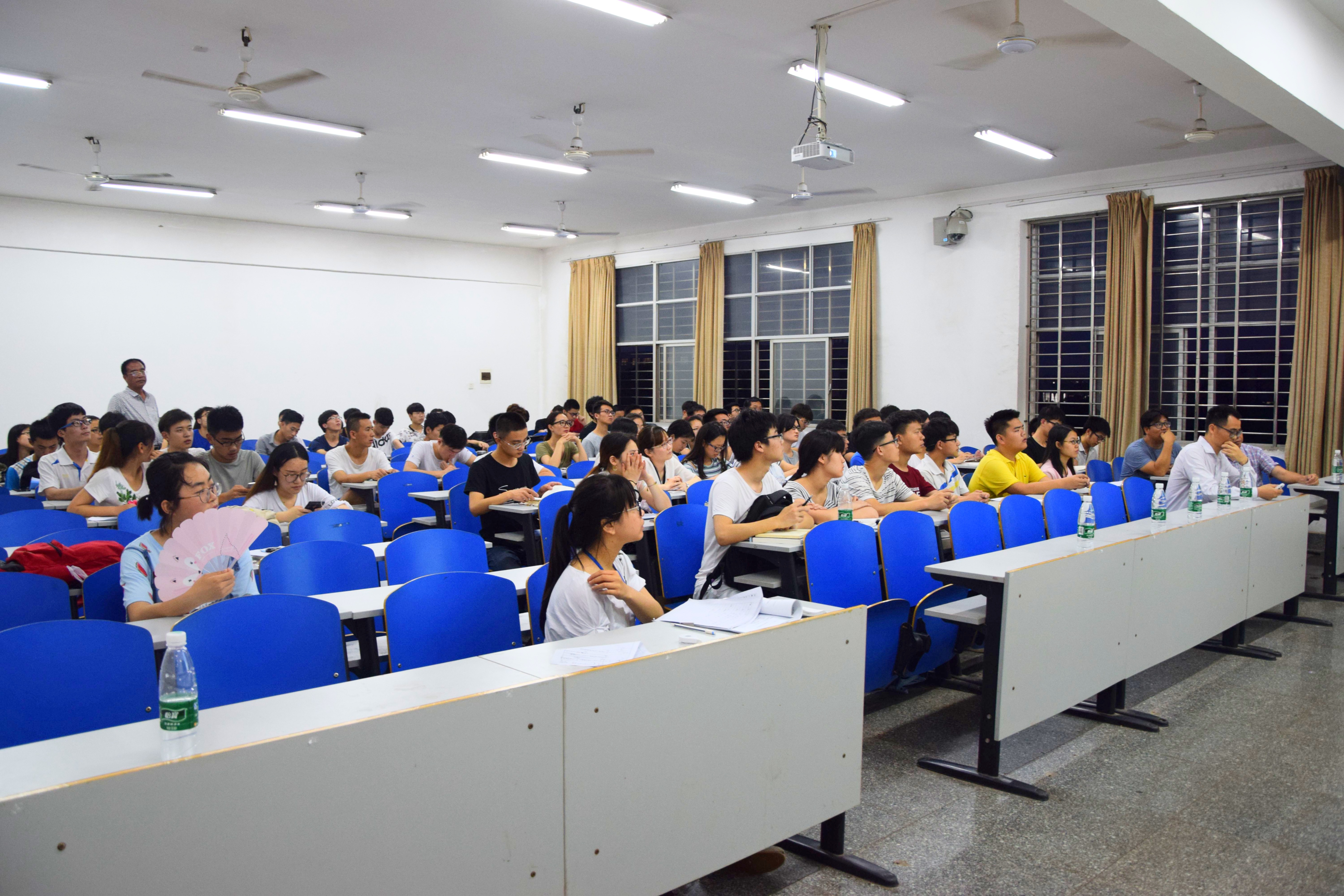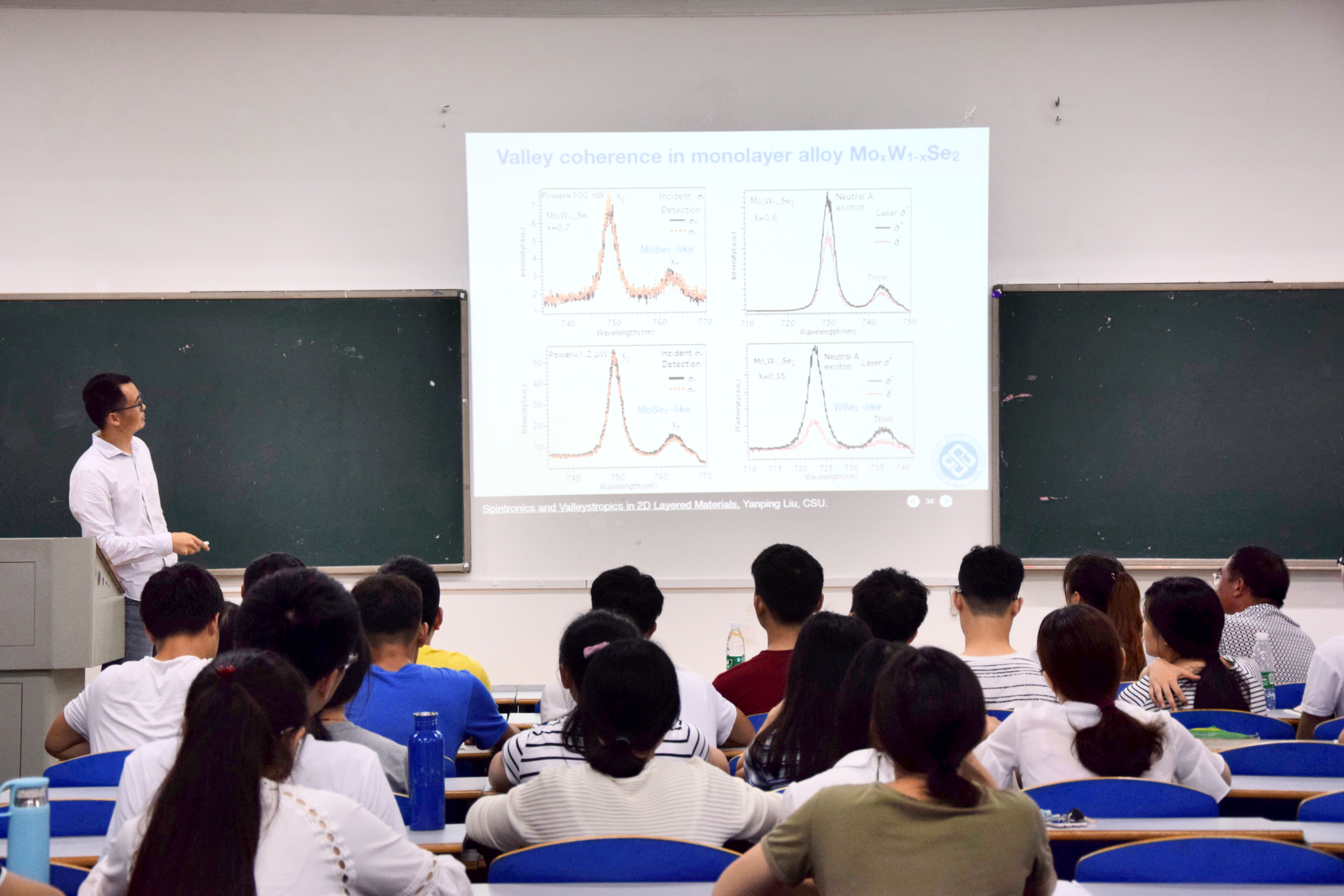 讲学开始,刘教授展示了基于二维层状材料自旋电子学和谷电子学的研究,他用精准与专业的知识让同学们看到了科学前沿领域的发展。紧接着,杨兵初教授向大家介绍了中南大学物理与电子公司的科研、实验、团队等方面的情况,同时向同学们分析了他们公司考研的基本情况。